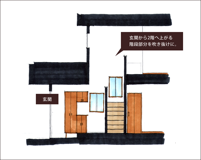玄関と2階への階段をつなぐ吹抜けは、